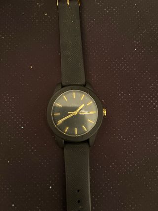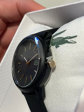 Elegante reloj con correa negra y detalles dorados. - Esfera negra con marcadores dorados. - Logo de Lacoste en la esfera. - Correa de material resistente.