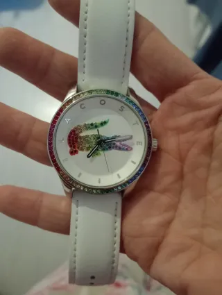 Elegante reloj Lacoste con correa blanca y detalles multicolor en el bisel y el logo. - Bisel adornado con piedras de colores. - Logo de cocodrilo de Lacoste con acabado brillante. - Correa de piel blanca. No tengo la caja pero está nuevo