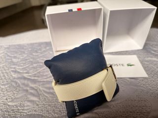 Elegante reloj Lacoste con un diseño moderno y sofisticado. - Esfera blanca con detalles dorados. - Correa de tela blanca. - Caja de reloj blanca. Le falta lo que es pasador Y le falta pila tambien