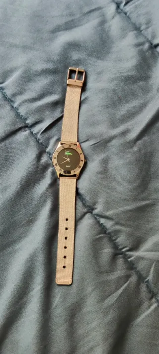 Elegante reloj Lacoste con detalles en dorado.nuevo a estrenar - Correa de material texturizado. - Esfera con marcadores dorados. - Logo del cocodrilo en la esfera.