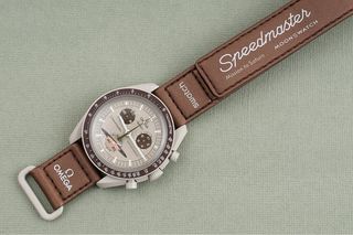 Reloj de la colaboración entre Swatch y Omega, modelo Mission to Saturn. - Correa de tela marrón. - Esfera con detalles en marrón y beige. - Cierre de velcro.