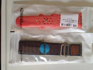 5 correas para Apple Watch, una roja y otra marrón. - Correa roja de silicona con detalles salpicados, compatible con tamaños 42/44/45mm. - Correa marrón de tela con hebilla metálica, compatible con tamaños 38/40/41mm. - Fabricado en China.