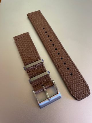 Correa canvas marrón 20mm, 75-130mm de longitud. Hebilla y pasadores de acero inoxidable. Pasadores de liberación rápida. Nueva a estrenar. # Moonswatch, Seiko, SKX, Omega, Rolex, Burton, Nixon, IWC, Casio, Tissot, Breitling, Garmin, Suunto, Daytona, submariner, Hamilton, Tag Heuer, Certina...