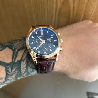 Elegante reloj de pulsera con detalles dorados y esfera marron. - Caja de acero inoxidable dorada. - Correa de piel marrón. - Esfera azul con índices y manecillas doradas. - Cronógrafo con subesferas.