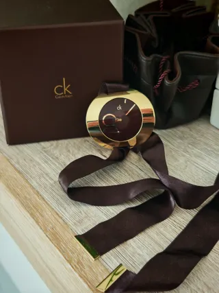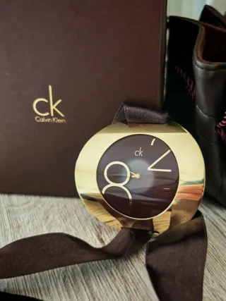 Elegante reloj de Calvin Klein con un diseño sofisticado. - Esfera redonda dorada. - Correa de tela marrón. - Detalles metálicos dorados en la correa. - Otras correas de colores para combinar