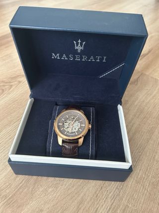 Elegante reloj Maserati con correa de piel y mecanismo automático. - Esfera negra con detalles plateados. - Diseño skeleton que permite ver el mecanismo. - Correa perforada para mayor comodidad. - PVP en tienda: 395€ Solo hago envios, escucho tu oferta.