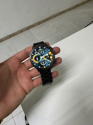Reloj de pulsera marca reconocida con movimiento automático y resistencia al agua de 100 metros. Movimiento japones, ver foto.Dos correas, metálica y de caucho deportiva. Se entrega con caja Deluxe con cremallera, pero no tengo la original ni papeles de marca. Se entrega como se ve. Espectacular!!!!!!!! - Esfera oscura con números luminiscentes. - Indicador de día y fecha. - Bisel giratorio. - Correa de metal.