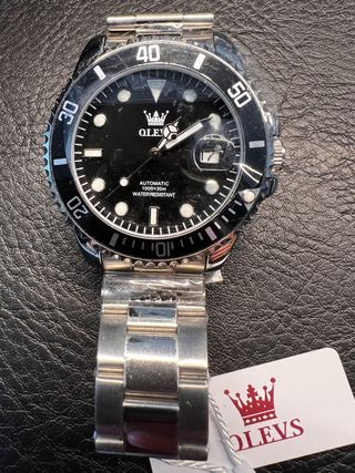 Elegante reloj OLEVS automático, completamente nuevo. - Diseño moderno con detalles plateados y esfera negra. - Correa de eslabones metálicos. - Bisel giratorio con marcadores de tiempo.