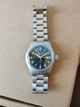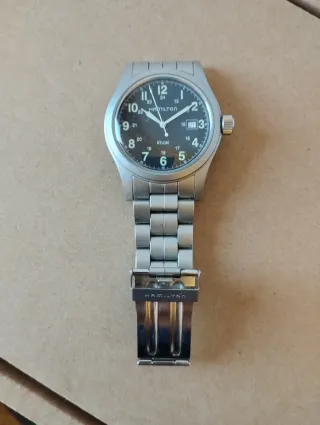 Reloj Hamilton Khaki vintage de cuarzo 40-42mm en muy buen estado, cristal perfecto Con su brazalete original Cambio rápido de fecha Funciona perfectamente, necesita cambio de pila - Esfera negra. - Correa de metal plateada.