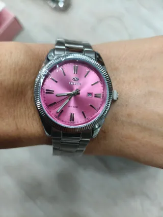 Reloj Marea con una llamativa esfera fucsia y detalles plateados. - Correa de metal plateado. - Bisel con detalles. - Resistente al agua WR 50m.