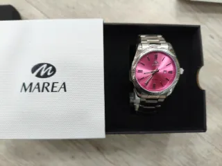 Elegante reloj Marea con un llamativo acabado rosa metalizado. Su diseño combina estilo y un toque de brillo. - Bisel adornado con pequeñas incrustaciones. - Correa acero tono fucsia. - Esfera con acabado radial.