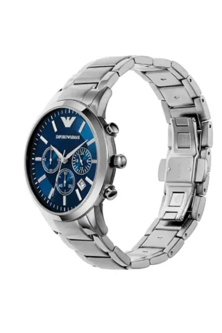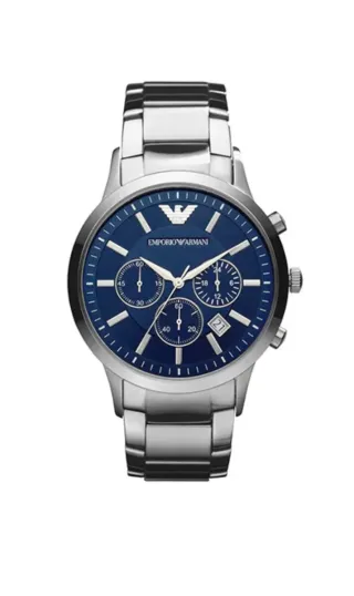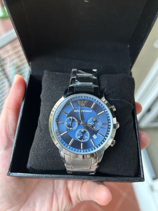 Elegante reloj Emporio Armani con esfera azul y detalles plateados. - Diseño cronógrafo. - Correa de metal. - Caja de presentación incluida.