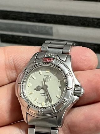 Elegante reloj TAG Heuer de estilo vintage. Su diseño combina tonos plateados y blancos para un look clásico. - Esfera de color blanco. - Correa de metal plateado. - Bisel con marcadores.