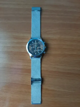 Elegante reloj para caballero con un diseño moderno y sofisticado. Pila gastada - Esfera en tono oscuro. - Correa de malla metálica plateada. - Detalles en contraste.