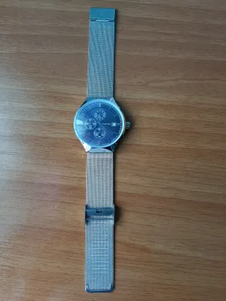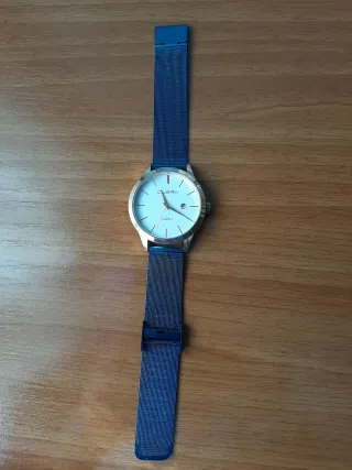 Elegante reloj para caballero con un diseño moderno y sofisticado. - Correa de malla metálica en color azul. - Esfera redonda con detalles plateados. - Indicador de fecha.