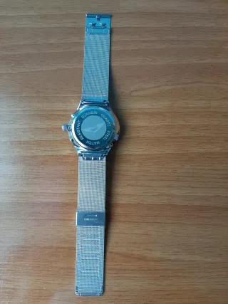 Reloj de pulsera con diseño moderno y elegante. Correa y caja de metal plateado. Puesto muy pocas veces.