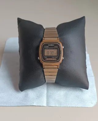 Reloj Casio con acabado dorado y pantalla digital. Dorado desgastado del uso pero funciona perfectamente. Entrega a mano. - Diseño clásico y versátil. - Correa metálica ajustable. - Resistente al agua.