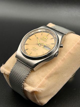 Reloj de pulsera Orient con un diseño clásico y elegante. - Esfera en tono dorado. - Correa de malla metálica plateada. - Indicador de día y fecha.