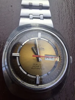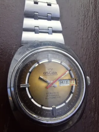 Reloj de pulsera de la marca Oscar con movimiento automático. - Esfera en tono dorado y plateados. - Indicador de día y fecha. - Correa metálica. - 25 rubis. - Caja de acero Inox. - Recién revisado y engrasado por maestro relojero. - Perfecto estado estético y funcional. - Fabricado en Suiza.
