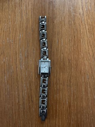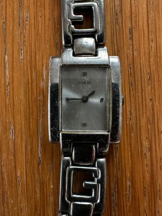 Elegante reloj de pulsera de la marca Guess. - Diseño rectangular. - Correa metálica plateada con eslabones. - Esfera gris.