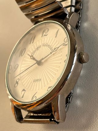 Reloj de caballero Giorgie Valentian. Es un reloj elegante y en excelentes condiciones. - Correa de metal elástica - Gran esfera blanca con detalles plateados. - Modelo Q0859 Si te interesa, mándame un mensaje y le pongo pila y compruebo el funcionamiento.