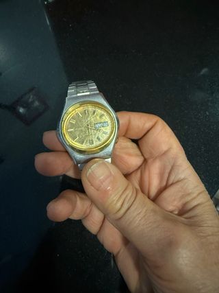Elegante reloj de pulsera para caballero con una combinación de colores dorados y plateados. lleva mucho tiempo parado por falta de pila y el único problema que tiene es que el cristal está rayado. - Diseño clásico y versátil. - Correa de metal. - Esfera con marcadores de hora.