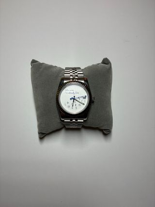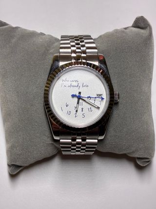 Reloj Seiko modificado con un diseño único. - Esfera blanca con texto personalizado. - Correa de metal plateada.