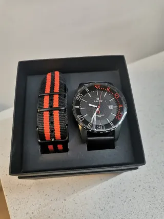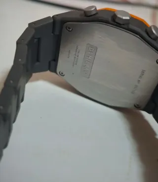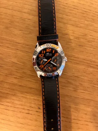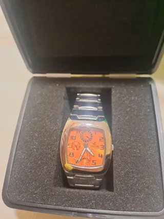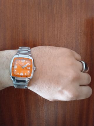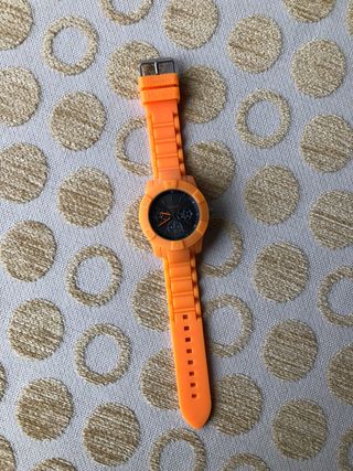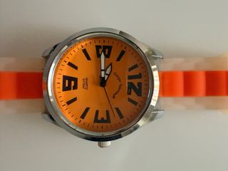 Reloj deportivo con llamativo dial naranja y correa bicolor. - Esfera con marcadores de hora luminosos. - Correa de tela resistente en naranja y negro.200 mts maquinaria miyota muy esacta y fiable esta como nuevo - Bisel giratorio.