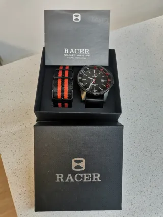 Reloj deportivo Racer con correa intercambiable. - Esfera negra con detalles naranjas. - Correa de tela a rayas naranjas y negras. Nunca se ha utilizado
