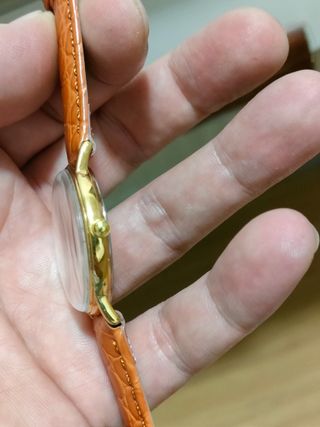 Elegante reloj de la marca Longines con una correa de cuero. - Caja de metal en tono dorado. - Correa de cuero con acabado texturizado en color naranja. Esfera nueva recien cambiada en la relojería Como nuevo.caja chapado en oro que aun lleva la protección en la tapa