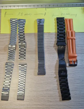 Lote de correas para reloj de diferentes materiales y acabados. Dos correas metálicas plateadas de 18mm. Una correa metálica plateada extensible. 18mm Una correa metálica negra de 20mm. Una correa de piel naranja de 20mm. 2€ La unidad, todo el lote 8