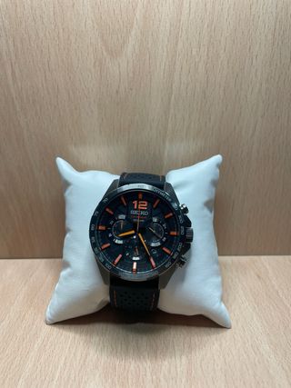 Reloj Seiko con diseño deportivo y detalles en naranja. - Esfera negra con marcadores y agujas en naranja. - Correa de caucho negra con detalles perforados. - Bisel con escala taquimétrica.