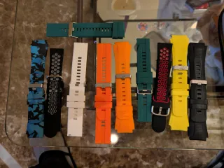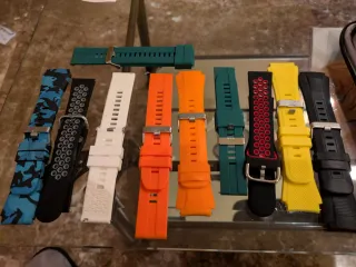 Conjunto de correas para reloj de diferentes colores y diseños. - Correa verde azulado - Correa azul con camuflaje - Correa negra con puntos - Correa blanca con patrón - Correa naranja - Correa verde - Correa negra con puntos rojos - Correa amarilla - Correa negra 22mm