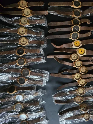 Lote de relojes NUEVOS para MUJER con esfera en madera y correa de cuero. Por cese de negocio. 16 uds . Esfera Negra 🌑 3 Uds. Esfera Naranja 🧡 6 Uds. Esfera Crema🟡 9 Uds. Esfera Crema-Minitero Negro 🟡🌑 Total -34 relojes: 170€ Por unidad : 10 €