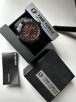 Reloj Time Force con un diseño deportivo y moderno. - Esfera negra con detalles en naranjas. - Movimiento de cuarzo - Correa de caucho negra. - Caja color negro. - Indicador de fecha. Nuevo, sin uso con su caja original y manual.