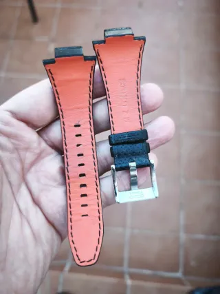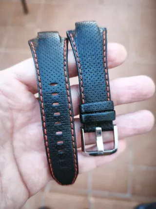 Correa original Seiko Sportura en piel negra microperforada con el ribete en color naranja, modelo 4KG8JZ UNICAMENTE VÁLIDA PARA LOS MODELOS SNL017P1, SNL021P9 y 7L22-0AE0 La compré hace bastantes años pero me equivoqué de modelo y desde entonces ha estado sin uso, como puede verse en las imágenes, metida en un cajón. Por favor, revisa bien tu modelo y asegúrate que la correa te servirá. - Material: Piel. - Color: Negro. - Costuras: Naranja. - Hebilla: Metálica.