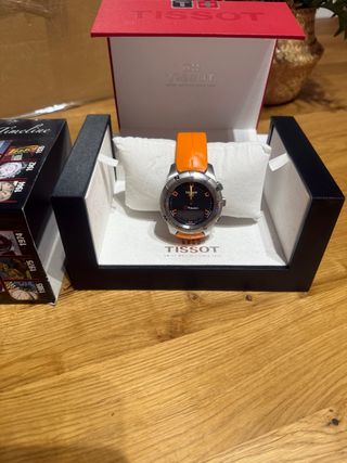 Reloj Tissot T-Touch con correa naranja y detalles plateados. Se encuentra en excelente estado, como si fuera nuevo. - Correa de silicona naranja. - Caja de acero inoxidable plateada. - Esfera negra con detalles en naranja.