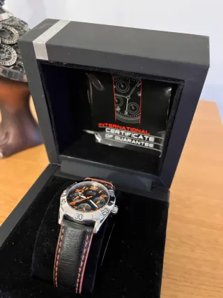 Reloj TAG Heuer 373.513 Fórmula 1 de primera generación, un fantástico vintage con movimiento ETA suizo de cuarzo, diametro de caja 35 mm (sin contar corona), correa caucho naranja original. Comprado en Octubre de 2025 en esta misma plataforma. Lo vendo para adquirir otra pieza/reloj. En perfecto estado estético como funcional. Precio negociable, abstenerse ofertas absurdas. Más relojes en mi perfil.