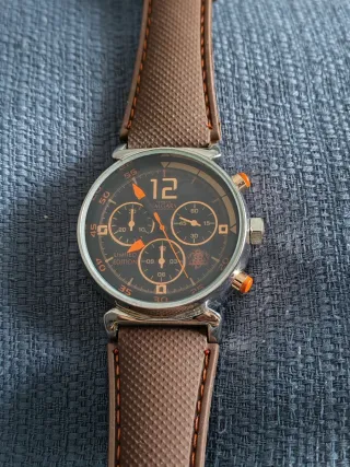 Elegante reloj de pulsera con correa de cuero marrón y detalles en naranja. - Esfera negra con números y manecillas en contraste. - Cronógrafo con tres subesferas. - Edición limitada. - Correa con textura y pespuntes. - Hebilla plateada.