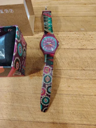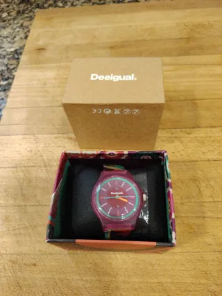 Reloj de la marca Desigual con un diseño llamativo. - Correa de color morado. - Esfera con detalles en verde y naranja. Hay que cambiar pila