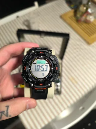 Reloj Casio Pro Trek PRG-340 con tecnología Tough Solar. - Resistente al agua 10 BAR. - Pantalla digital. - Correa de resina negra con detalles naranjas. Barómetro Altímetro Brújula Cómo nuevo Preferiblemente trato en mano