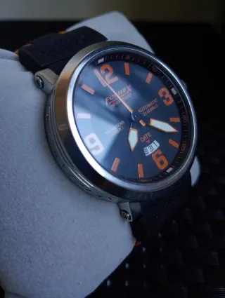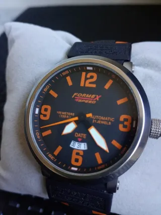 Reloj Formex 4Speed con diseño deportivo y detalles en naranja,en excelente estado, prácticamente sin uso Sistema de suspensión patentado - Esfera negra con números e indicadores en naranja. - Correa de caucho con detalles. - Resistencia al agua de 100 metros (330 ft). - Movimiento automático con 21 joyas. - Ventana de fecha. Correa de caucho original Se entrega con caja (deteriorada), documentación El reloj está como nuevo Preferencia trato en mano,envío a cuentas muy bien valoradas Seiko, citizen,formex, Hamilton, Omega, Rolex
