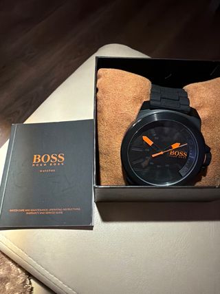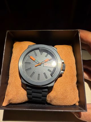 Reloj Hugo Boss modelo New York con un diseño moderno y llamativo. - Esfera texturizada en gris. - Detalles en color naranja vibrante. - Correa de caucho negra.
