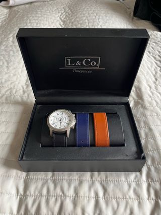Elegante reloj L&Co. con caja plateada y esfera blanca. Incluye tres correas de cuero para personalizar tu estilo. - Correa negra - Correa azul - Correa naranja