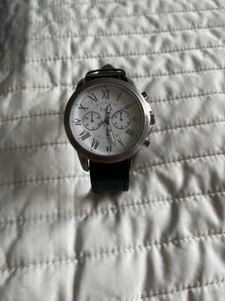 Reloj de pulsera con correa de cuero negra y detalles plateados. Con muy poco uso. - Correa de cuero. - Con caja original. - 22,5cm de longitud.