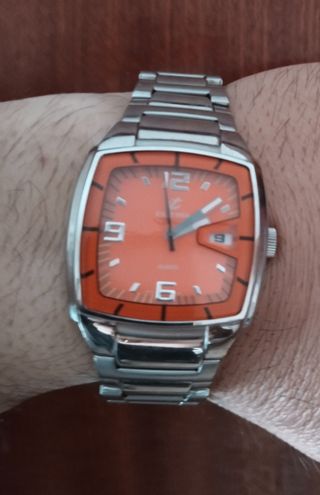 Reloj de pulsera con un llamativo diseño. Reloj analógico Calypso modelo K5176. Pila cambiada el 09/01/2026. Funciona perfectamente. - Esfera de color naranja vibrante. - Correa de eslabones plateados.