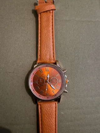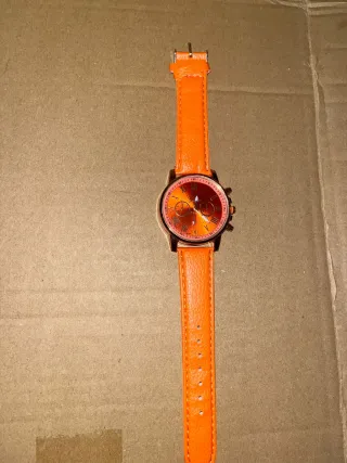 Elegante reloj de pulsera con un diseño llamativo. - Correa de cuero naranja. - Esfera con detalles dorados y números romanos. - Bisel con acabado dorado. Sin ningún uso Caja incluida