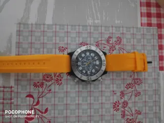 Reloj de pulsera con un diseño deportivo y moderno. - Bisel exterior naranja con textura. - Correa de caucho negra. - Esfera con detalles en naranja y agujas luminiscentes. EL RELOJ FUNCIONA PERFECTAMENTE Y SOLO LE FALTA LA CORREA. - TENGO MAS COSAS EN EL PERFIL