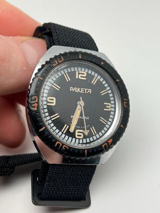 Reloj de pulsera Raketa con movimiento de cuarzo. Un accesorio clásico con un diseño atemporal. - Esfera negra. - Correa de tela negra. - Bisel giratorio con marcadores naranjas.