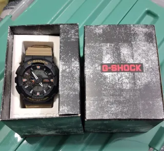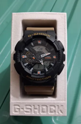 Reloj Casio G-Shock con correa en tonos marrones y caja negra. - Esfera con detalles en dorado y naranja. - Indicadores analógicos y digitales. - Resistente al agua WR20BAR. - Correa de resina.